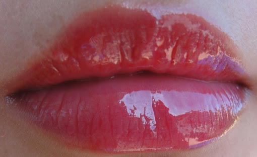 Rimmel Cherry Boost Moisture Renew Cream Watery Lipgloss on the lips (mind you, I was being super persistent and re-dipped for around 10 times)- The gloss wears comfortably but (the thick layer I applied) gets absorbed within 20 minutes due to its watery nature.
