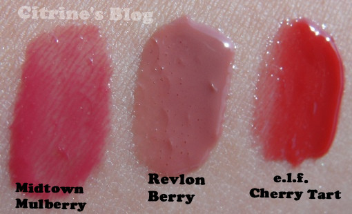 The applicator of the new liquid lipshine is flat, somewhat long, slightly resilient and soft to the touch. It grabs a decent amount of the gloss and feels rather comfortable on the lips. The caramel-scented gloss gives an impressive pigmentation consider the watery texture it has (that stays moist through out instead of drying into a stain) .Arm swatch of NYC Midtown Mulberry, with Revlon Cream Lip Gloss in Berry (very close to my natural lip color) and elf Luscious lip color in Cherry Tart (not sure why the shades now swatches so bright now I am darker). All three are my-lips-but-better sort of colors although they swatches so differently.