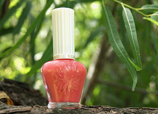 The shade I picked, Splendour is a lovely and flattering medium candy coral with beautiful soft golden shimmer (that forms a beautiful sheen as shown in the bottle but unfortunately, the dreamy sheen doesn't quite translate well on the nail) from spring 2011 Parasol Collection. While it smells just like other nail polish as it's applied, I can detect a noticeable Paul & Joe powdery (maybe orange blossom?) fragrance once it dries, which might be annoying for some.