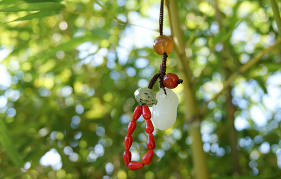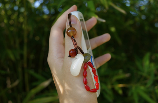 For the phone charm (it could be used on any object with a small hole), I used red coral beads (dyed ones, since it's cheap), green serpentine, white jade pendant and two carnelian beads. Putting them was simple (but it would be hard to explain) as I only used flat knot and snake knot.