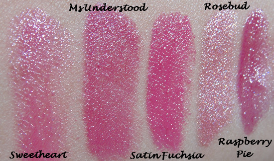Sweetheart, Max Factor Ms Understood, Lancome Satin Fuchsia, Rosebud, Raspberry Pie Lip Butter